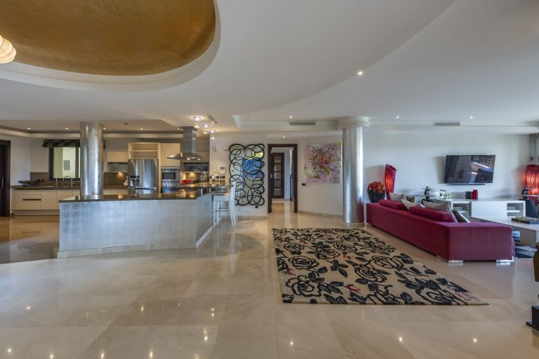 - 3 bedrooms, all with en-suite bathrooms – Primary suite with walk-in closet and private terrace – Two guest toilets – Large open-plan living and dining area with terrace access – Direct beach access and walking distance to Puerto Banús – Communal outdoor and indoor pools, gym, and spa – Two parking spaces and storage room – 24-hour security and doorman service