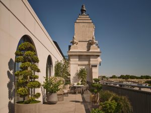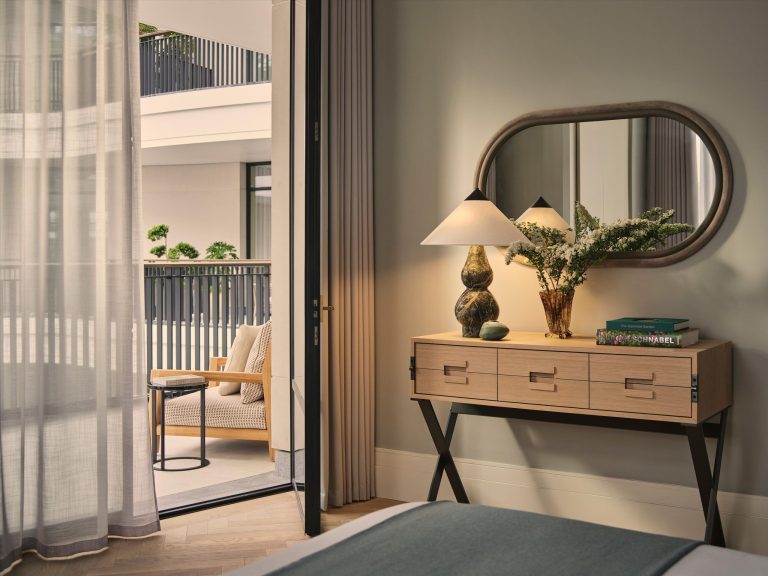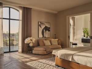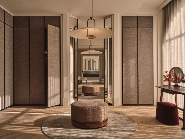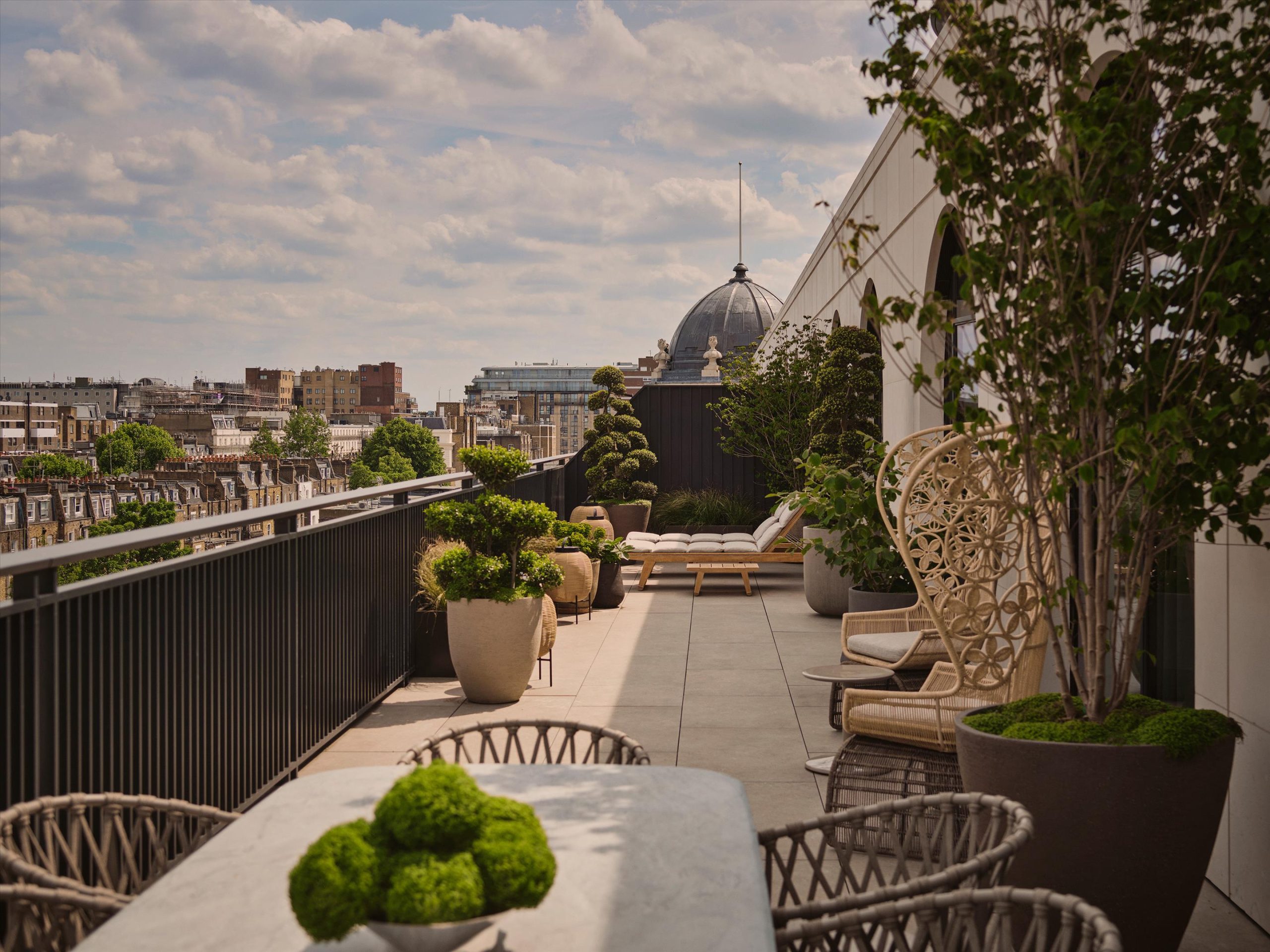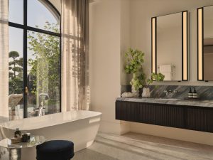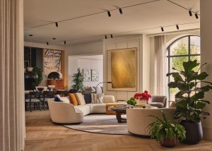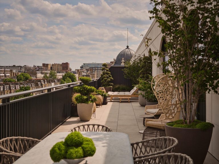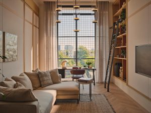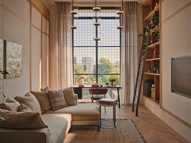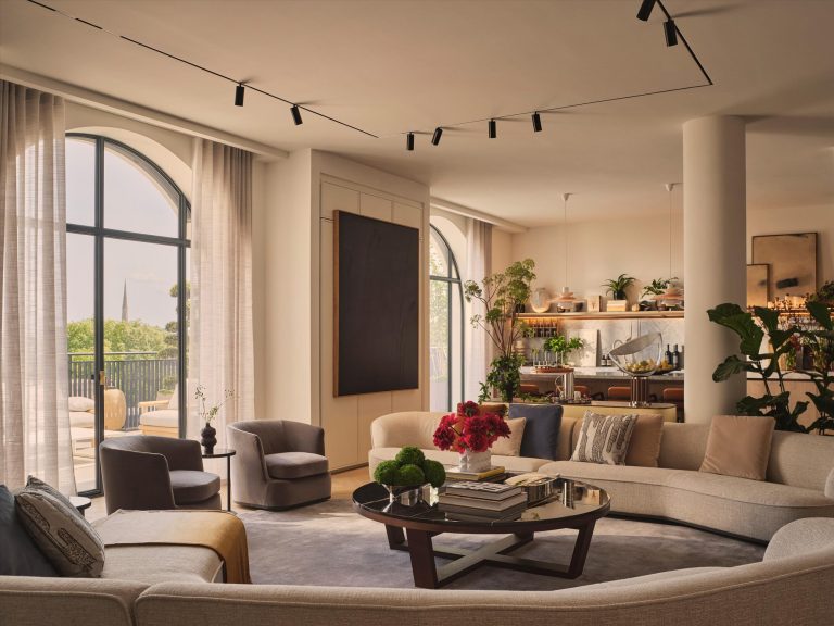 Covering an area of approximately 4,349 sq ft, the apartment exemplifies Maxalto’s distinctive style, characterized by meticulous detailing and outstanding craftsmanship throughout. At its center is an awe-inspiring six-metre-high clock tower room, which includes a custom floor-to-ceiling bookcase and offers sweeping views of the London skyline. A remarkable internal winter garden, encased by The Whiteley’s 1911 glass dome, floods the open-plan living and entertaining areas with natural light, creating a seamless connection to a private 952 sq ft outdoor terrace.