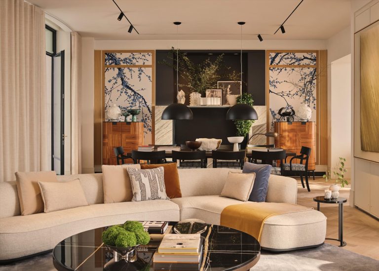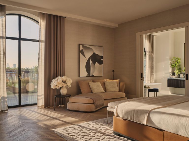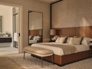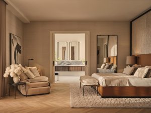 The interiors are a tribute to texture and design – featuring the Bianca Eclipsia quartzite kitchen and an opulent wenge dining table, alongside the sculptural Corteccia stone fireplace and custom boiserie wall paneling by B&B Italia. The principal suite boasts a tailored Kasia leather headboard, a spacious dressing room, and a lavish en suite, while three additional bedrooms and a dedicated study provide thoughtfully crafted areas for relaxation and productivity.