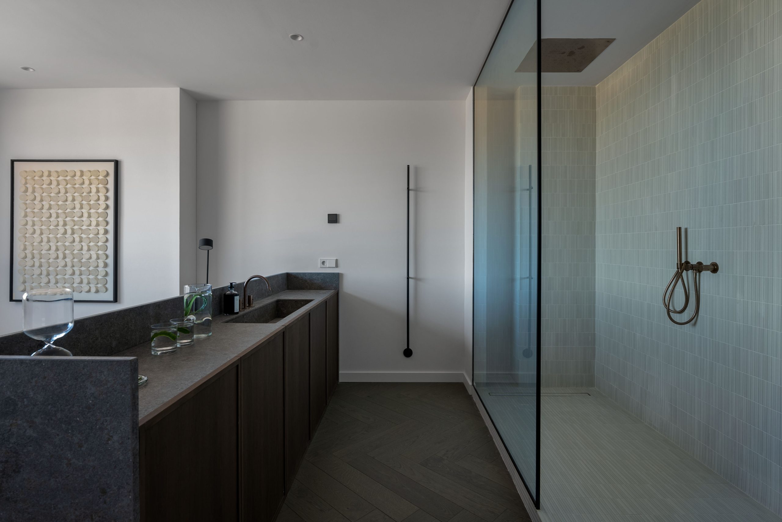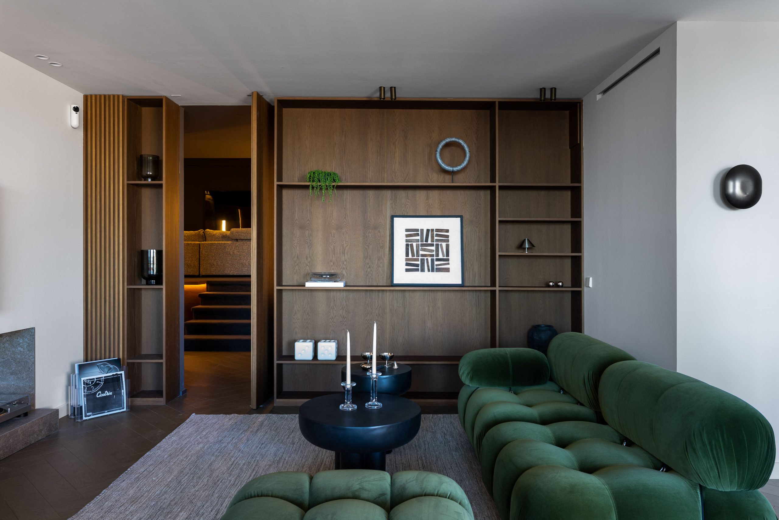 High-quality materials define the interior spaces, enhancing both style and durability. Rich dark oak wood, classic parquet flooring, and a carefully chosen palette of olive and royal green tones create a calm yet distinctive atmosphere. Elegant small-format tiles add texture and depth, reinforcing the penthouse’s bespoke feel.