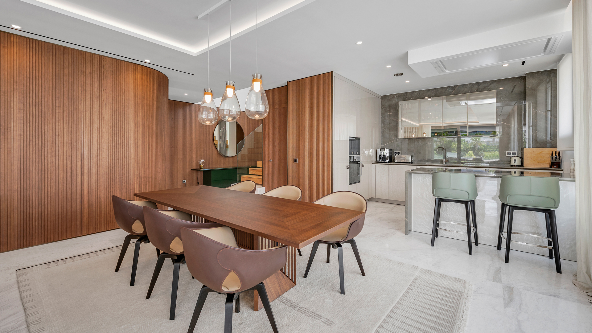 The interior showcases serene, natural hues, sleek lines, and luxurious finishes by Fendi. The open-concept living area connects to a broad southwest-facing terrace that offers unobstructed views of the landscaped gardens and sophisticated pool areas. Both the terrace and the rooftop provide clear vistas of the sea, embodying the Mediterranean way of life.