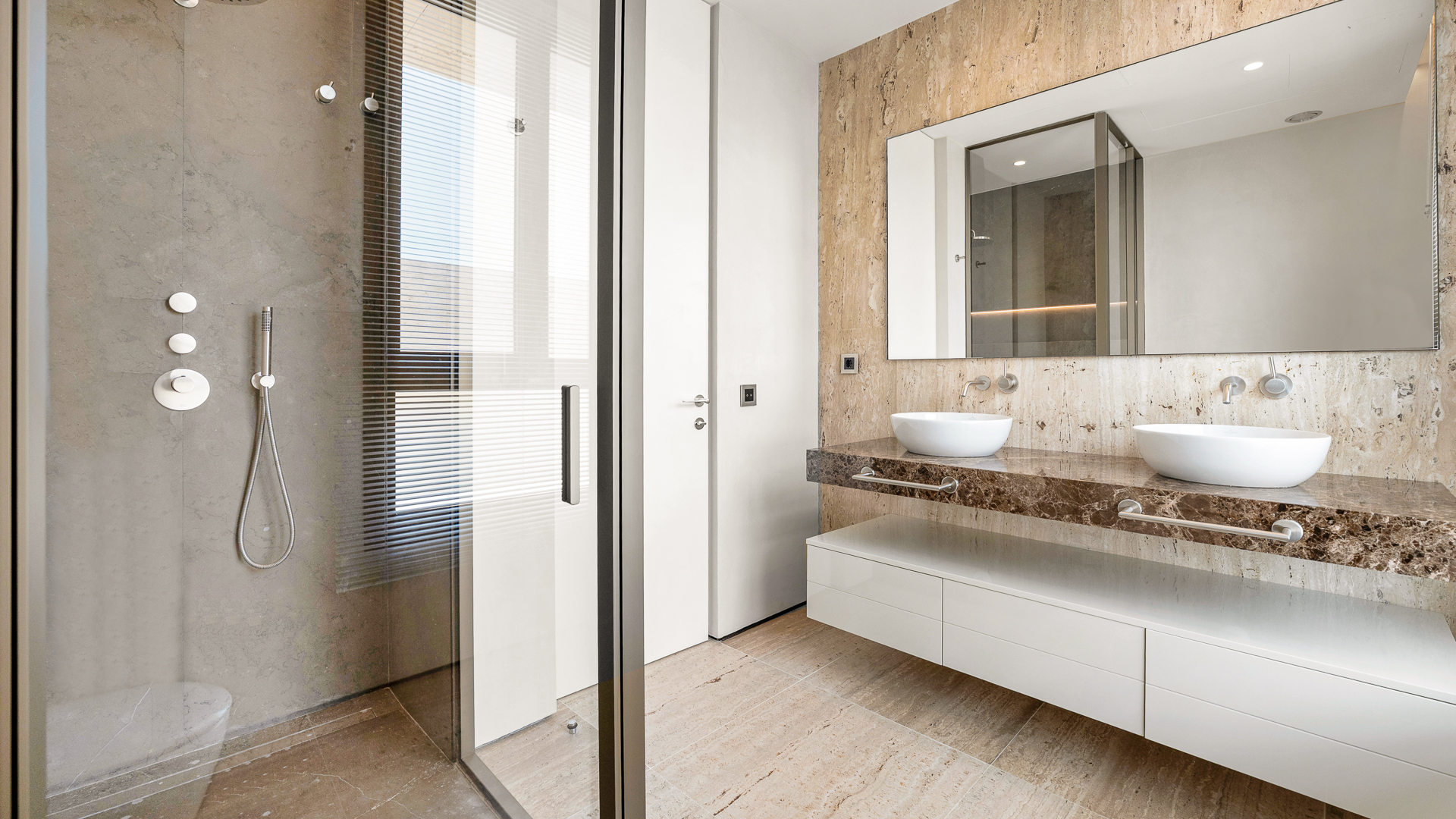 Each bedroom is designed with floor-to-ceiling windows, custom wardrobes, and en-suite bathrooms featuring stone finishes, double vanities, and rainfall showers that evoke a spa-like ambiance. The property also offers two underground parking spaces, a generous storage area, and 24-hour security.